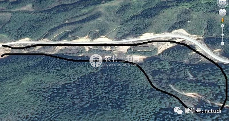 這是較早的衛(wèi)星圖片,山谷長度為1.3公里,整個山谷全程通4.5米寬水泥路,白色的線條為新開的省道。省道對面是已經(jīng)砍伐完畢的林地數(shù)百畝,可以養(yǎng)殖土雞。本圖片只畫了所有土地的一半